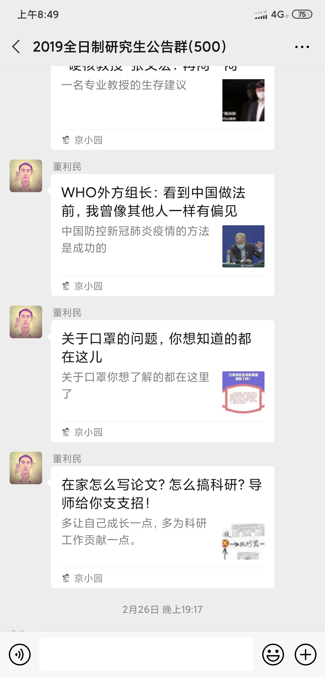 1月23日,武汉封城消息刚传出,学校即在班级群里发通知,开始统计大家的健康状况。此刻在家的我,有种感动,即使是放假学校还是关心着我们。到晚上时,老师发《新型冠状病毒肺炎预防手册》到群里,学校研工部及时在微信上推送“怎样预防新型冠状病毒?我们应该知道!”,给大家提供科学的预防建议。权威可信的信息不断的发布到班级群中,使我们在这未知的疫情面前不迷茫,不会被各种谣言假信息欺骗,让大家了解真实的情况,在疫情面前,有了坚定豁达乐观的心态,认真做好个人防护,配合村庄、政府做好防疫工作,相信党和国家、政府会有效应对此次疫情,我们一定会迎来一个明媚的春天。