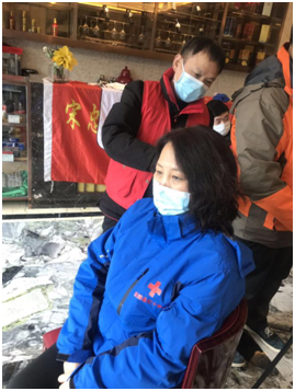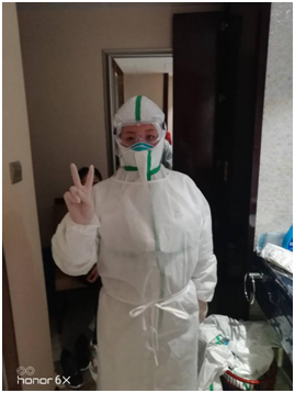 图4 为了穿防护服剃去部分长发 图5 穿上防护服的妈妈, 妈妈加油!