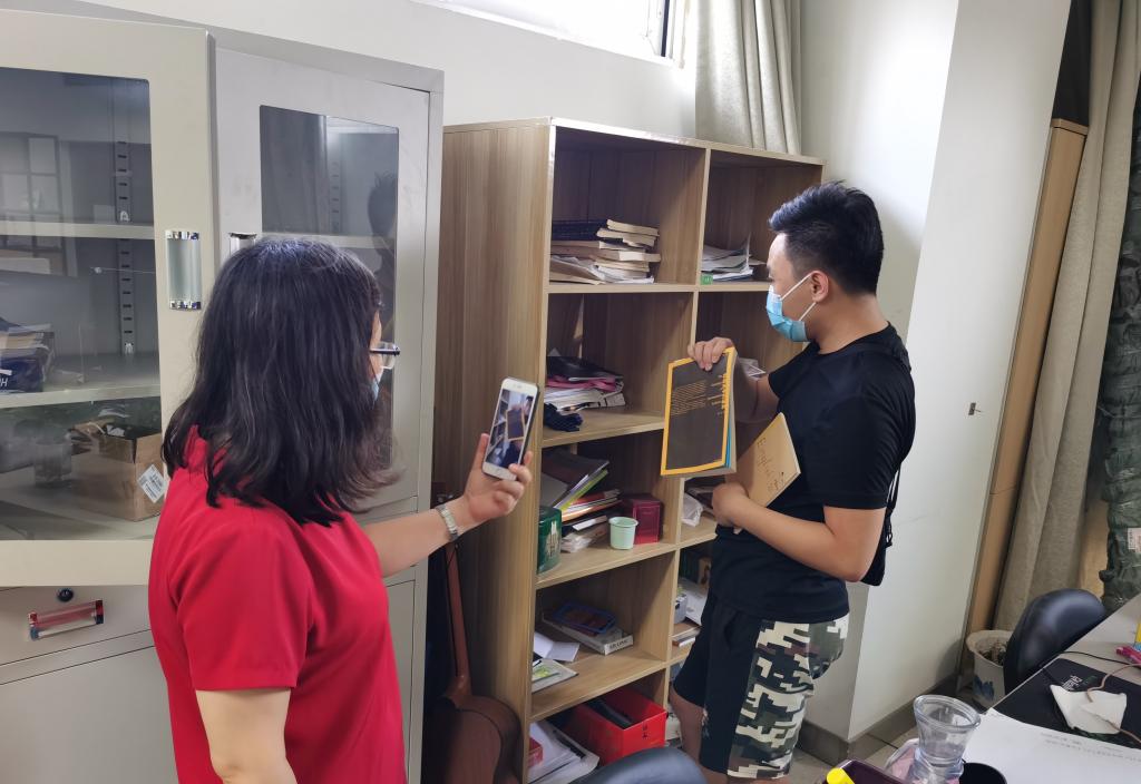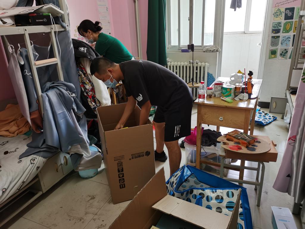 志愿服务团队通过视频直播的方式与研究生毕业生进行联系,仔细询问打包物品,细心整理收入箱子,打包和邮寄工作进行地有条不紊,最终为14名研究生毕业生完成行李打包工作。