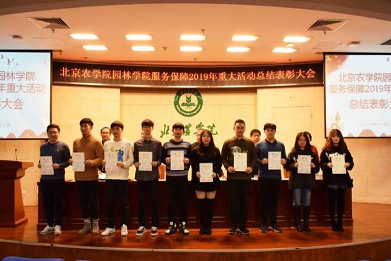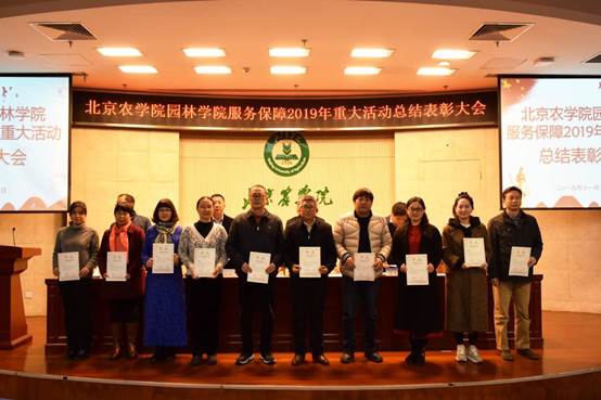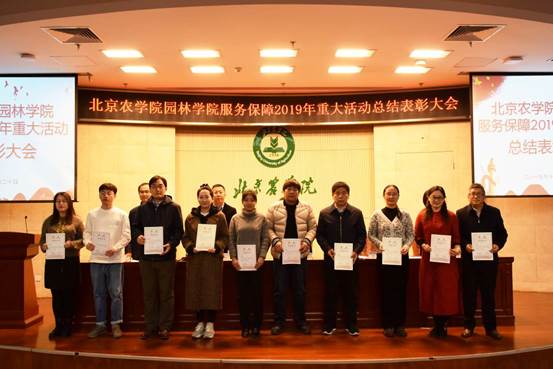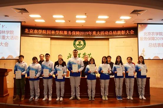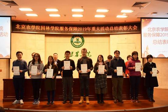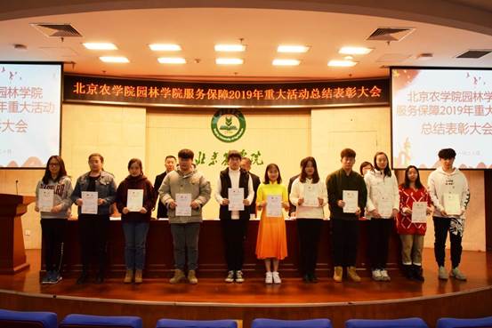 学院领导为国庆70周年庆祝活动广场合唱团先进个人、群众游行方阵先进个人,中国北京世界园艺博览会志愿者先进个人、北京农学院展台服务学生先进个人、服务保障教师先进个人和参展作品获奖的科技贡献先进个人颁奖。
