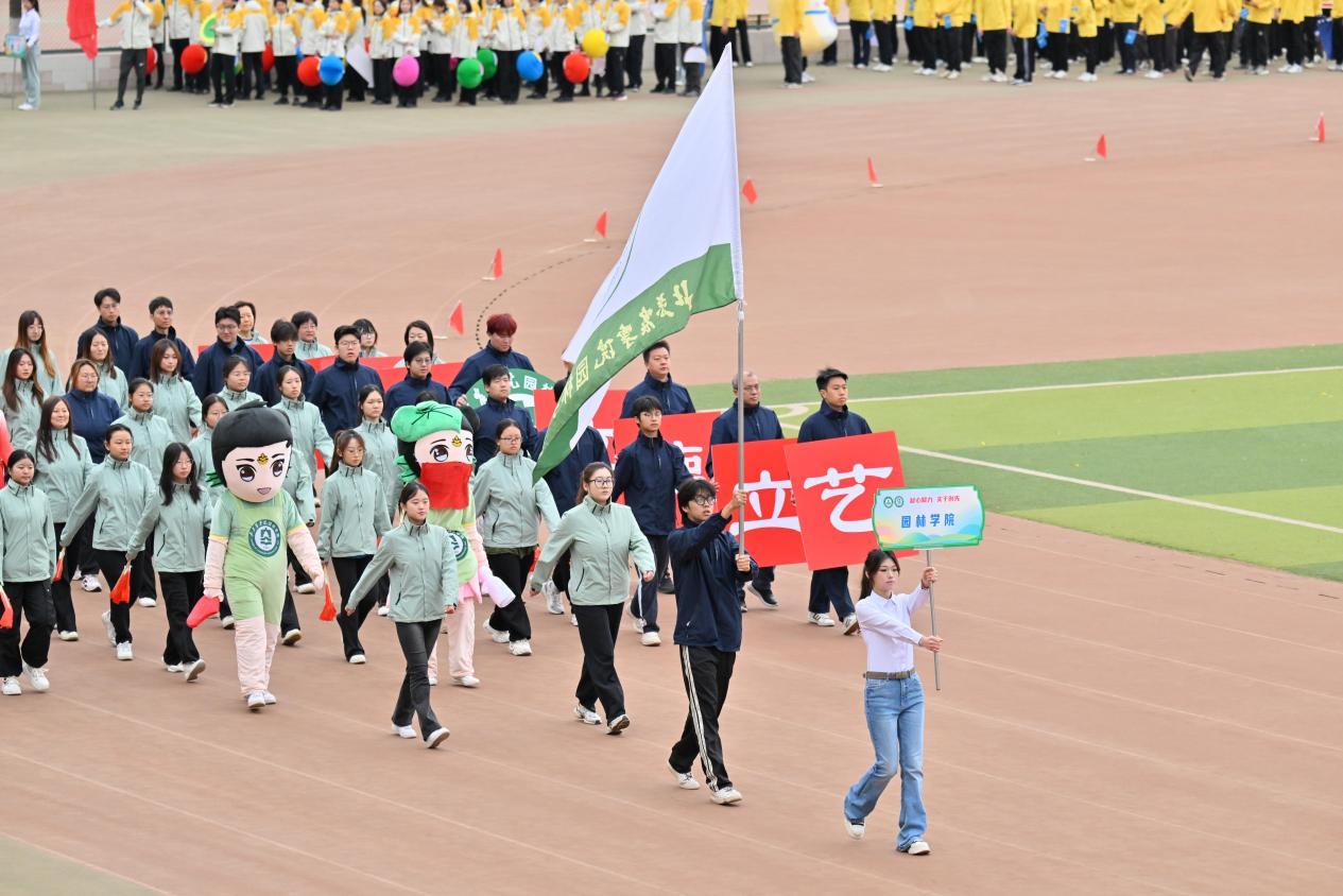方阵伴随着激昂的入场曲,迈着整齐划一的步伐走向主席台,吉祥物“园园”和“林林”挥动翠叶,萌态里蕴藏生态守护者的初心,学院师生秉承“树木树人,立德立艺”的院训精神,肩扛“实干创先”的奋斗旗帜,步履间尽显园林师生深耕大地的赤子情怀。